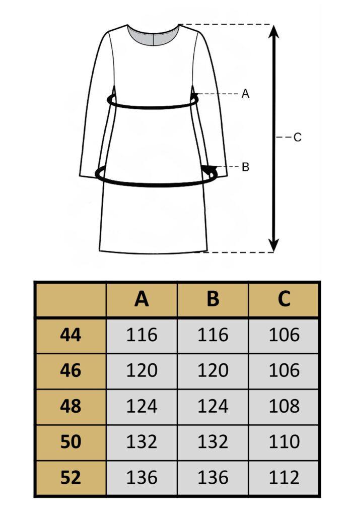 Produkty mierzymy na płasko, po zewnętrznej stronie, zapięte na guziki (zamek).  Aby wybrać najodpowiedniejszy rozmiar zmierz podobne ubranie ze swojej szafy i porównaj jego wymiary z tabelą rozmiarów danego produktu. Wymiary podane w tabeli mogą różnić się od wymiarów rzeczywistych produktu +/- 2cm. Modelka na zdjęciu ma 164 cm wzrostu i nosi rozmiar 44.