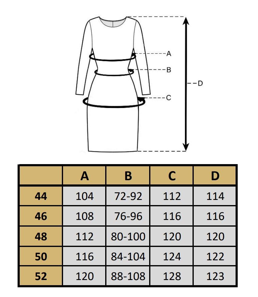 Produkty mierzymy na płasko, po zewnętrznej stronie, zapięte na guziki (zamek). Wymiary podane w tabeli mogą różnić się od wymiarów rzeczywistych produktu +/- 2cm. Modelka na zdjęciu ma 164 cm wzrostu i nosi rozmiar 44.