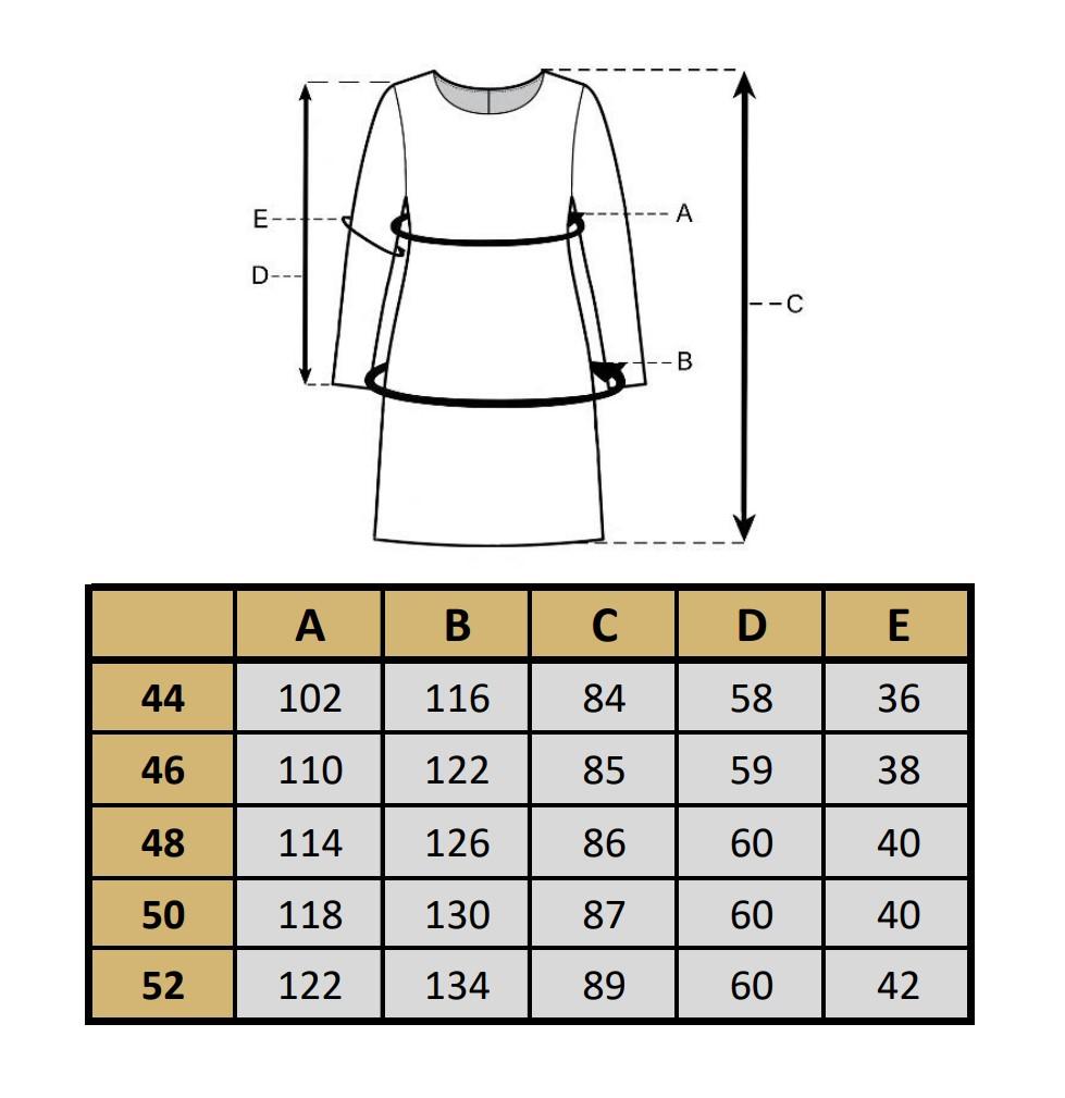 Produkty mierzymy na płasko, po zewnętrznej stronie, zapięte na guziki (zamek).  Aby wybrać najodpowiedniejszy rozmiar zmierz podobne ubranie ze swojej szafy i porównaj jego wymiary z tabelą rozmiarów danego produktu. Modelka na zdjęciu ma 164 cm wzrostu i ma założony rozmiar 44.