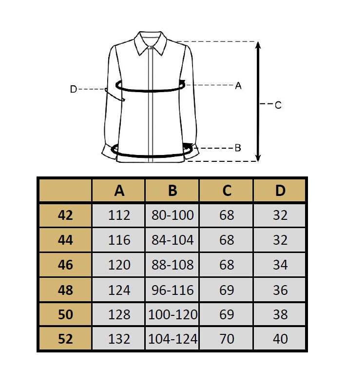 Produkty mierzymy na płasko, po zewnętrznej stronie, zapięte na guziki (zamek).  Aby wybrać najodpowiedniejszy rozmiar zmierz podobne ubranie ze swojej szafy i porównaj jego wymiary z tabelą rozmiarów danego produktu. Modelka na zdjęciu ma 164 cm wzrostu i ma założony rozmiar 42.