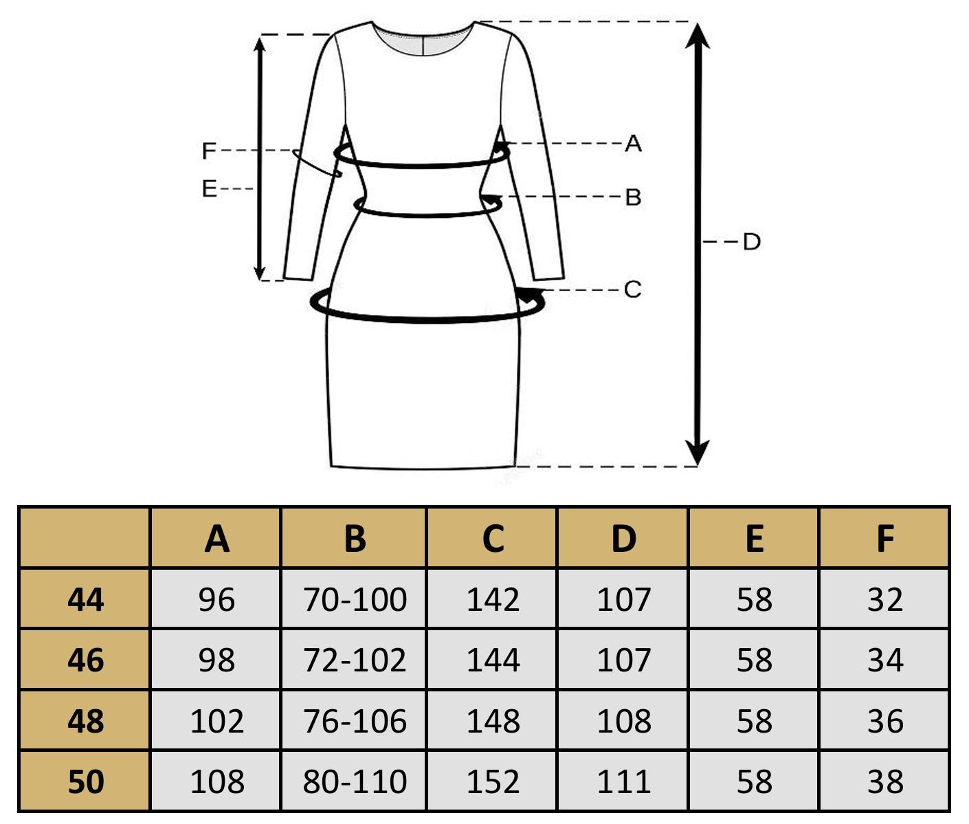 Produkty mierzymy na płasko, po zewnętrznej stronie, zapięte na guziki lub zamek. Podane w tabeli wymiary to obwody – dlatego szerokość zmierzona na płasko jest mnożona razy 2. Wymiary mogą różnić się od wymiarów rzeczywistych produktu +/- 2cm. Modelka na zdjęciu ma 164 cm wzrostu i nosi rozmiar 44.