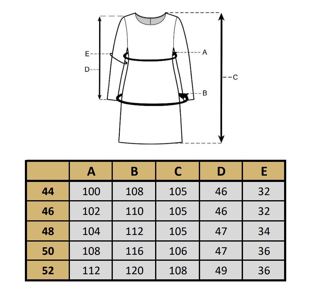 Produkty mierzymy na płasko, po zewnętrznej stronie, zapięte na guziki (zamek).  Aby wybrać najodpowiedniejszy rozmiar zmierz podobne ubranie ze swojej szafy i porównaj jego wymiary z tabelą rozmiarów danego produktu. Wymiary podane w tabeli mogą różnić się od wymiarów rzeczywistych produktu +/- 2cm. Modelka na zdjęciu ma 164 cm wzrostu i nosi rozmiar 44.