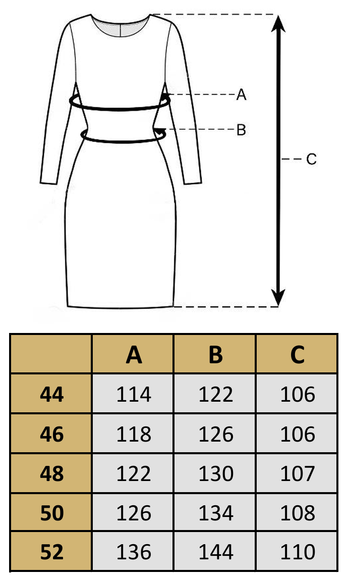 Produkty mierzymy na płasko, po zewnętrznej stronie, zapięte na guziki (zamek). Wymiary podane w tabeli mogą różnić się od wymiarów rzeczywistych produktu +/- 2cm. Modelka na zdjęciu ma 164 cm wzrostu i nosi rozmiar 44.