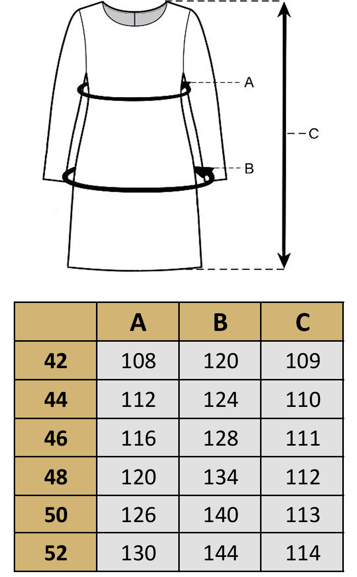 Produkty mierzymy na płasko, po zewnętrznej stronie, zapięte na guziki (zamek).  Aby wybrać najodpowiedniejszy rozmiar zmierz podobne ubranie ze swojej szafy i porównaj jego wymiary z tabelą rozmiarów danego produktu. Wymiary podane w tabeli mogą różnić się od wymiarów rzeczywistych produktu +/- 2cm. Modelka na zdjęciu ma 164 cm wzrostu i nosi rozmiar 42.