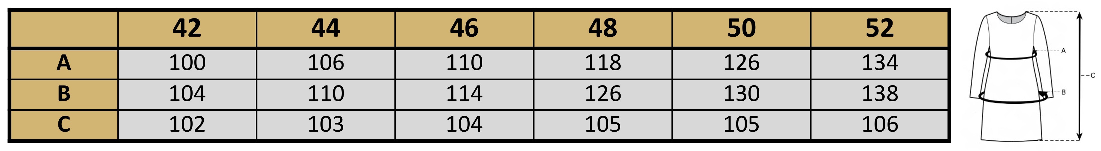 Produkty mierzymy na płasko, po zewnętrznej stronie, zapięte na guziki (zamek). Wymiary podane w tabeli mogą różnić się od wymiarów rzeczywistych produktu +/- 2cm. Modelka na zdjęciu ma 164 cm wzrostu i nosi rozmiar 44.