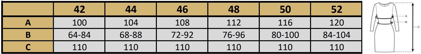 Produkty mierzymy na płasko, po zewnętrznej stronie, zapięte na guziki (zamek).  Aby wybrać najodpowiedniejszy rozmiar zmierz podobne ubranie ze swojej szafy i porównaj jego wymiary z tabelą rozmiarów danego produktu. Wymiary podane w tabeli mogą różnić się od wymiarów rzeczywistych produktu +/- 2cm. Modelka na zdjęciu ma 164 cm wzrostu i nosi rozmiar 42.