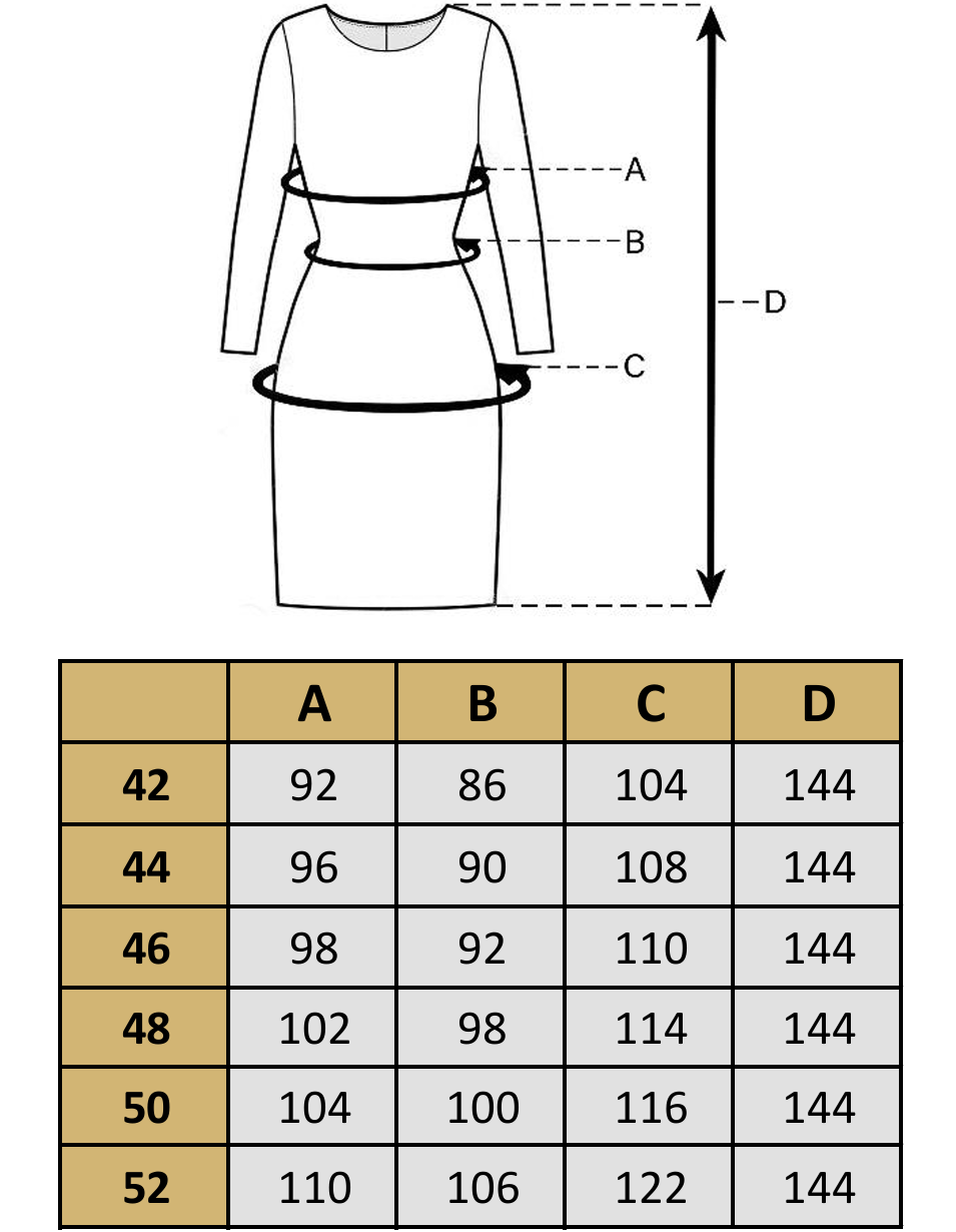 Produkty mierzymy na płasko, po zewnętrznej stronie, zapięte na guziki (zamek). Wymiary podane w tabeli mogą różnić się od wymiarów rzeczywistych produktu +/- 2cm. Modelka na zdjęciu ma 164 cm wzrostu i nosi rozmiar 42.