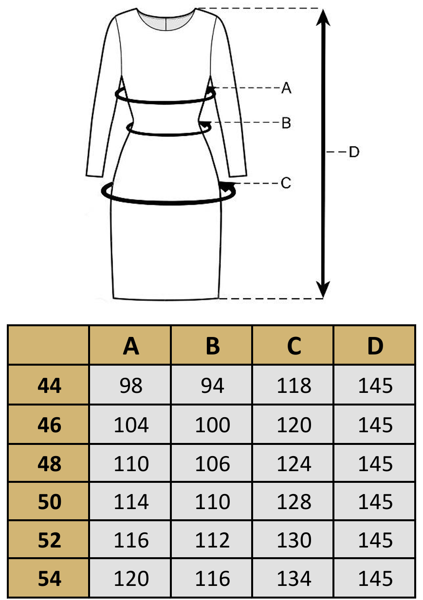 Produkty mierzymy na płasko, po zewnętrznej stronie, zapięte na guziki (zamek). Wymiary podane w tabeli mogą różnić się od wymiarów rzeczywistych produktu +/- 2cm. Modelka na zdjęciu ma 164 cm wzrostu i nosi rozmiar 44.