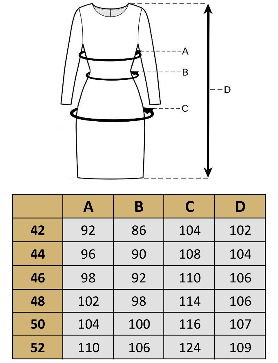 Produkty mierzymy na płasko, po zewnętrznej stronie, zapięte na guziki (zamek). Wymiary podane w tabeli mogą różnić się od wymiarów rzeczywistych produktu +/- 2cm. Modelka na zdjęciu ma 164 cm wzrostu i nosi rozmiar 42.