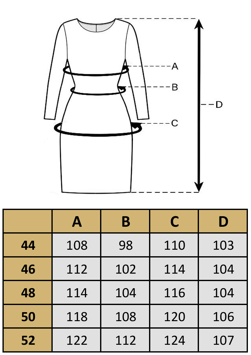 Produkty mierzymy na płasko, po zewnętrznej stronie, zapięte na guziki (zamek).  Aby wybrać najodpowiedniejszy rozmiar zmierz podobne ubranie ze swojej szafy i porównaj jego wymiary z tabelą rozmiarów danego produktu. Wymiary podane w tabeli mogą różnić się od wymiarów rzeczywistych produktu +/- 2cm. Modelka na zdjęciu ma 164 cm wzrostu i nosi rozmiar 44.