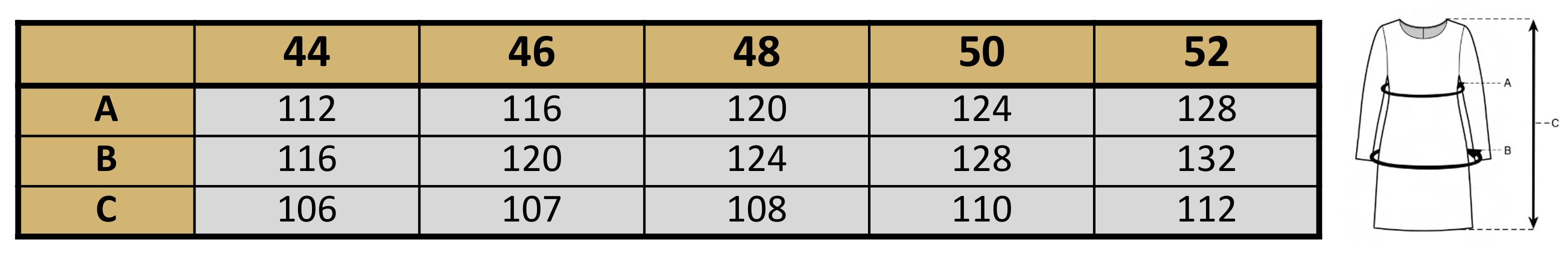 Produkty mierzymy na płasko, po zewnętrznej stronie, zapięte na guziki (zamek).  Aby wybrać najodpowiedniejszy rozmiar zmierz podobne ubranie ze swojej szafy i porównaj jego wymiary z tabelą rozmiarów danego produktu. Wymiary podane w tabeli mogą różnić się od wymiarów rzeczywistych produktu +/- 2cm. Modelka na zdjęciu ma 164 cm wzrostu i nosi rozmiar 44.