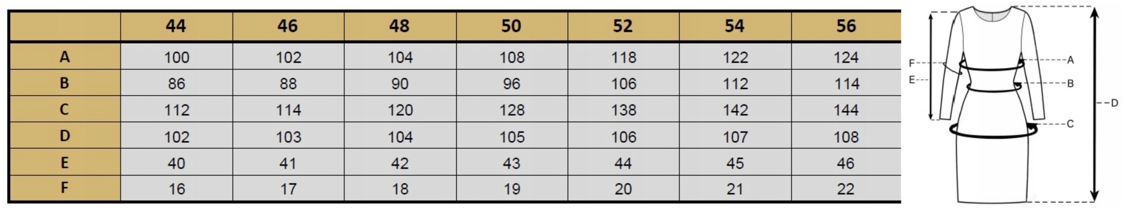 Produkty mierzymy na płasko, po zewnętrznej stronie, zapięte na guziki (zamek). Aby wybrać najodpowiedniejszy rozmiar zmierz podobne ubranie ze swojej szafy i porównaj jego wymiary z tabelą rozmiarów danego produktu. Wymiary podane w tabeli mogą różnić się od wymiarów rzeczywistych produktu +/- 2cm. Modelka na zdjęciu ma 164 cm wzrostu i nosi rozmiar 44.