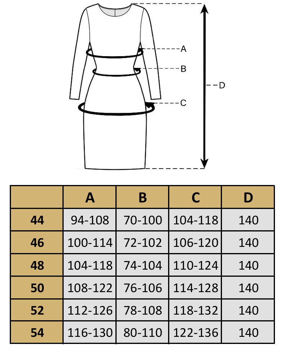 Produkty mierzymy na płasko, po zewnętrznej stronie, zapięte na guziki (zamek).  Aby wybrać najodpowiedniejszy rozmiar zmierz podobne ubranie ze swojej szafy i porównaj jego wymiary z tabelą rozmiarów danego produktu. Wymiary podane w tabeli mogą różnić się od wymiarów rzeczywistych produktu +/- 2cm. Modelka na zdjęciu ma 164 cm wzrostu i nosi rozmiar 44.